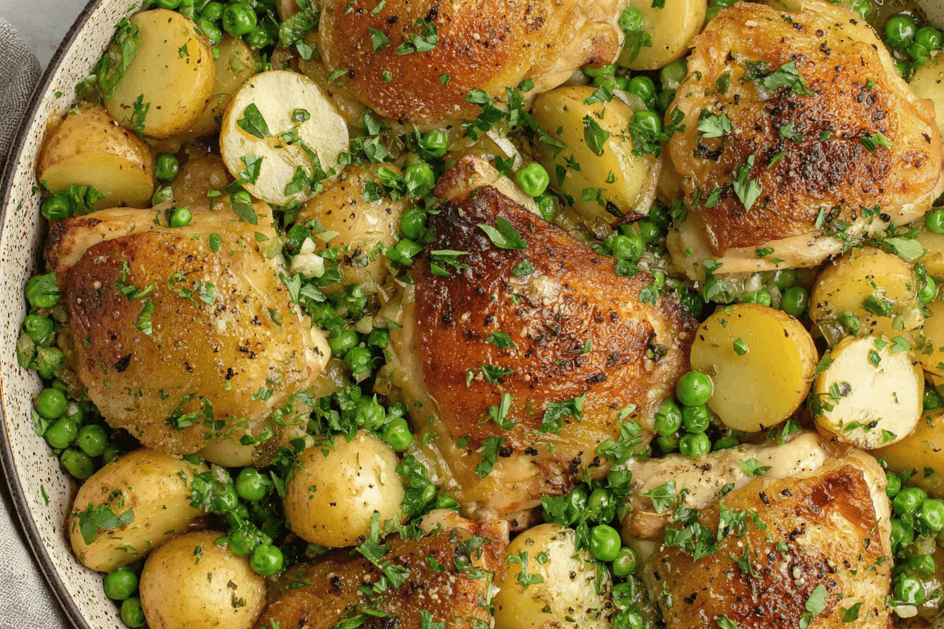 - Place the seared chicken thighs on top of the potatoes and peas. Transfer the skillet to the oven and bake for about 30 minutes until the chicken is cooked through and the potatoes are tender. The internal temperature of the chicken should reach 165°F (75°C).