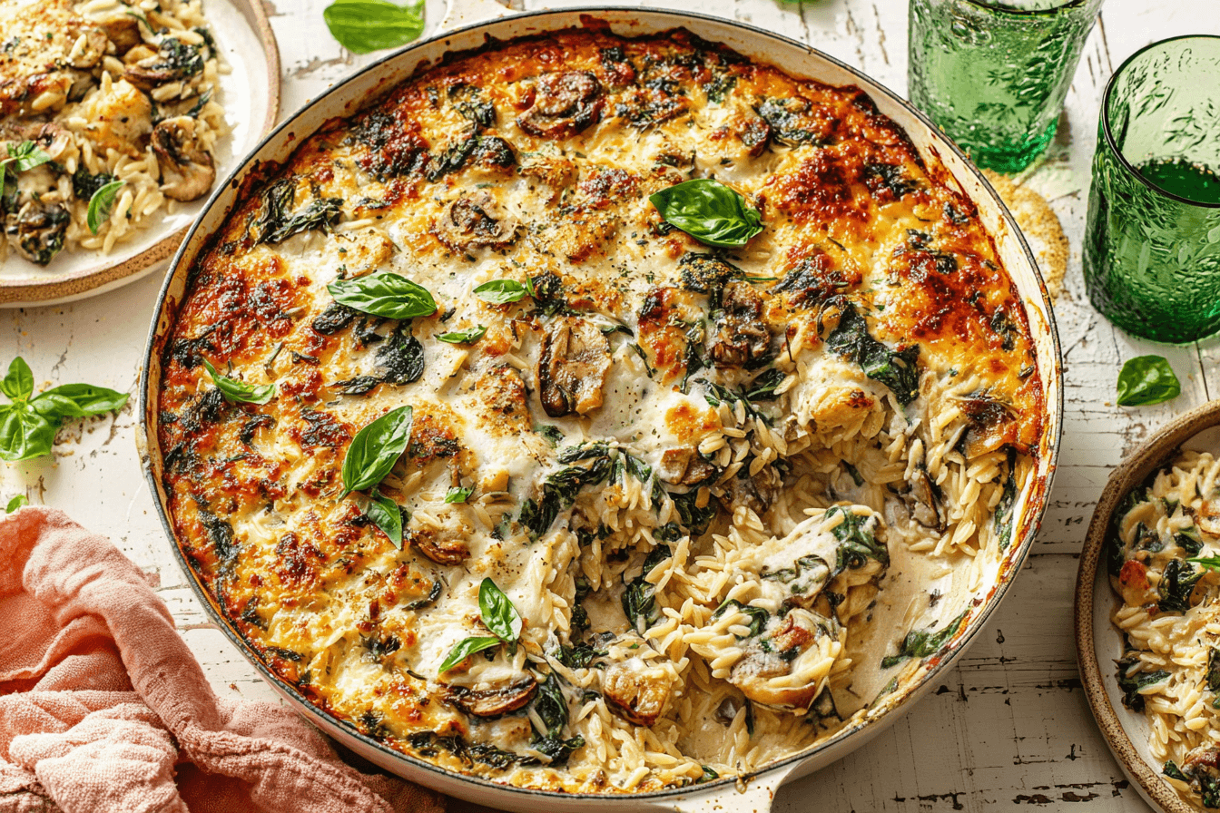 - Garnish with fresh basil, serve, and enjoy your delicious Chicken and Orzo Bake!