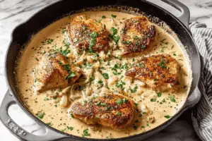 This recipe stands out for several reasons. First, the combination of sour cream and onion creates a sauce that is both creamy and tangy, enhancing the chicken’s flavor without overwhelming it. The use of fresh ingredients, like garlic and parsley, adds a layer of freshness that’s delightful. Additionally, it’s a quick recipe that can be on your table in just 35 minutes, making it perfect for busy weeknights or a relaxed weekend dinner.